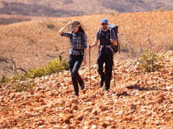 A majority of the terrain on the Larapinta Trail is hard, rough and rocky, particularly on high ground, in gorges, creek and river beds. The ground is often distorted with embedded or loose rock depending on the trail variations.